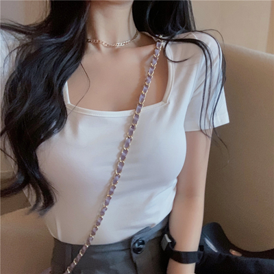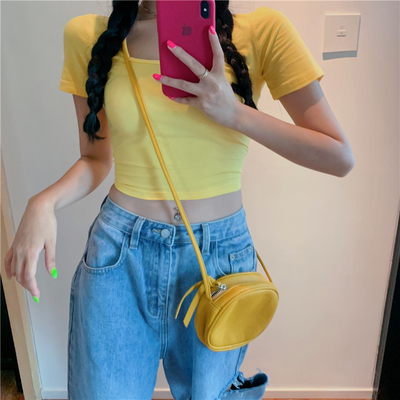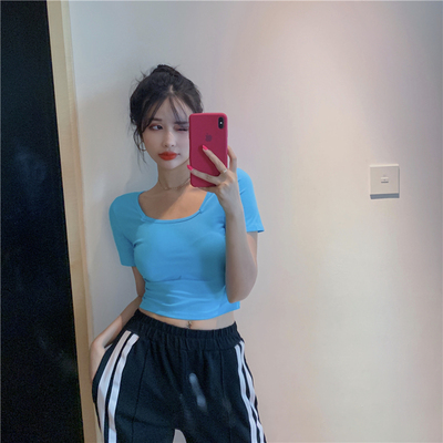 Real price spring and summer new Korean high waist short sexy navel exposed solid color square neck short sleeve T-shirt women's top