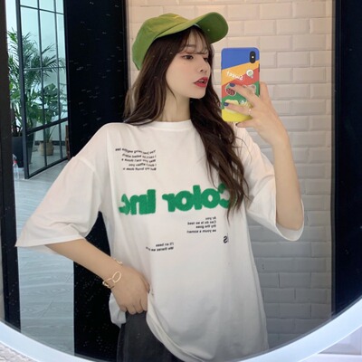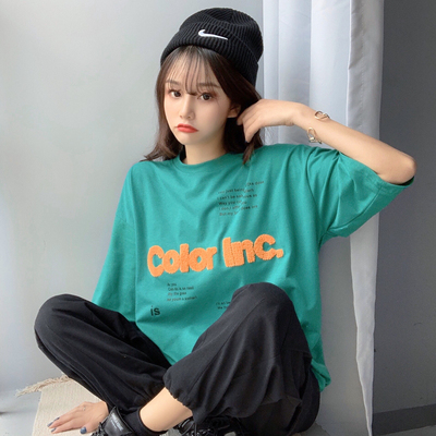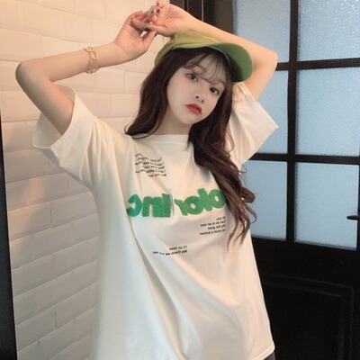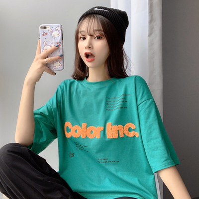 Real photo 2021 new summer clothing academy style letter embroidery half sleeve top medium length short sleeve t-shirt female