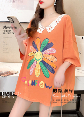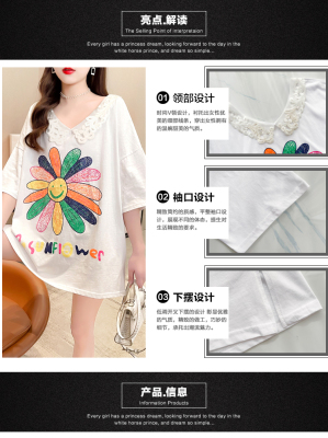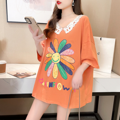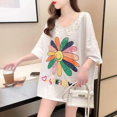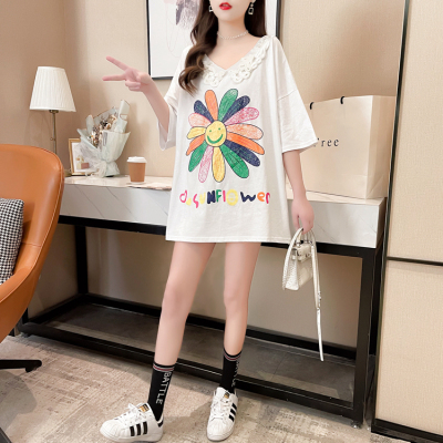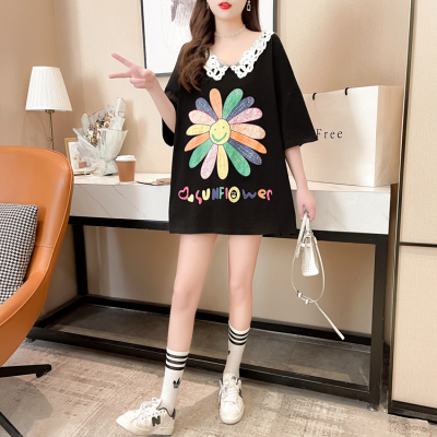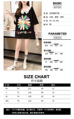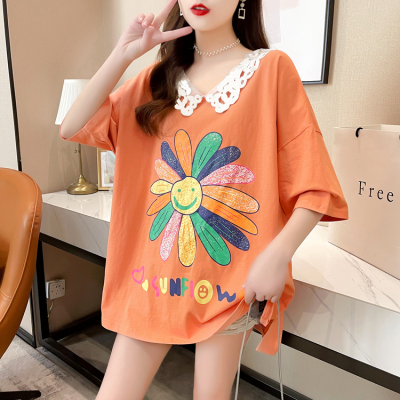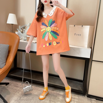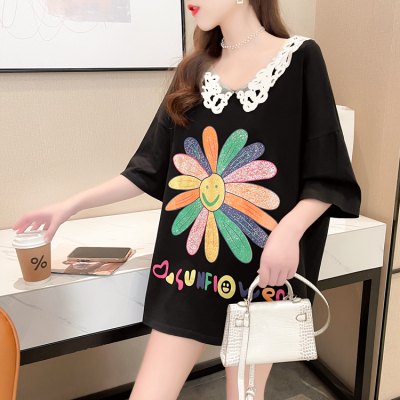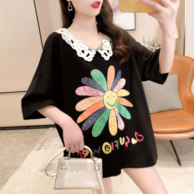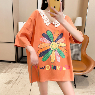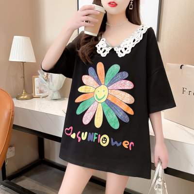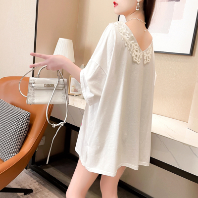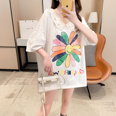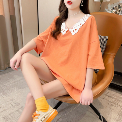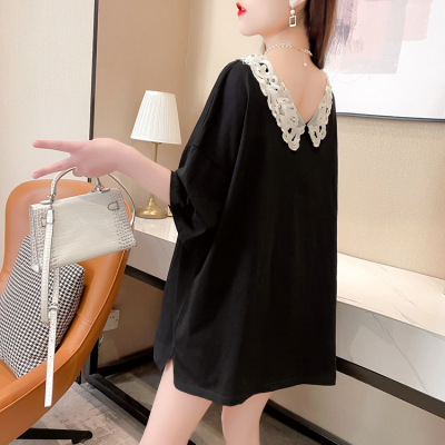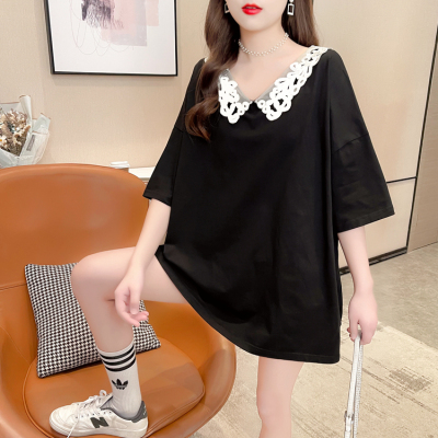 實拍棉花邊領短袖恤女夏季韓版大碼中長款大版上衣