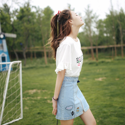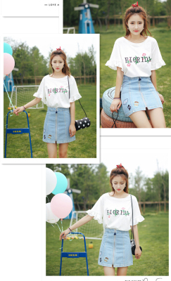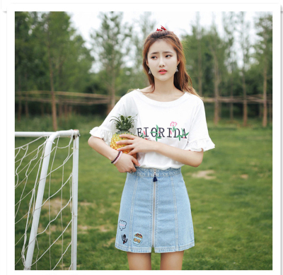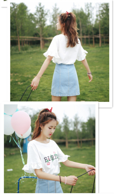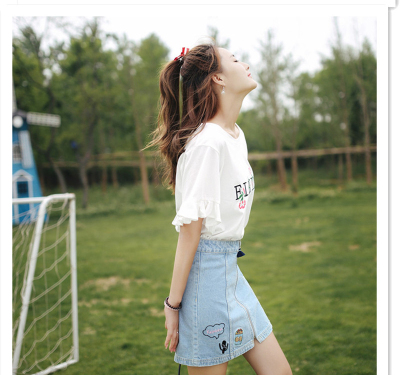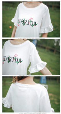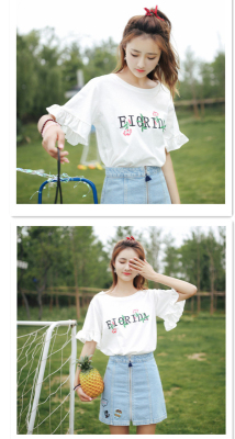 Summer Cherry Blossom embroidered T-shirt short sleeve Korean student flared Sleeve Ruffle Top