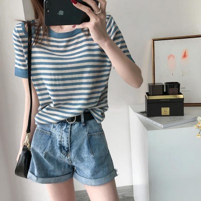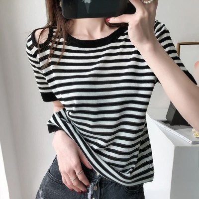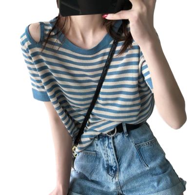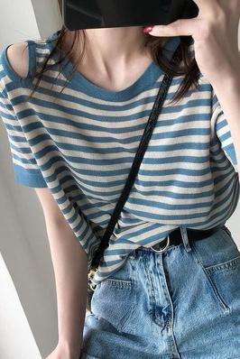 Ice silk T-shirt short sleeve Pullover summer thin off shoulder striped T-shirt loose Korean versatile thin top