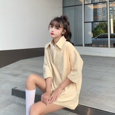 Real shot zipper pocket short sleeve T-shirt women's cotton loose half sleeve top