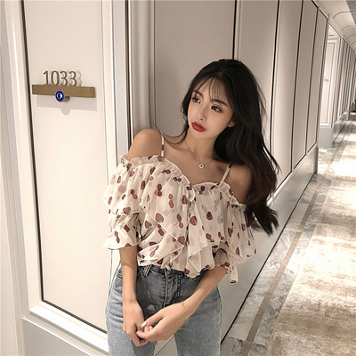 Real price real shot V-neck floral cover belly chiffon shirt women's short sleeve foreign style super fairy suspender off shoulder top