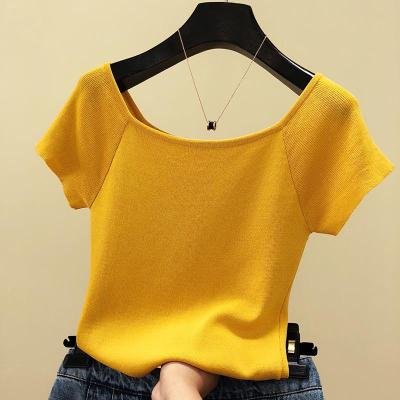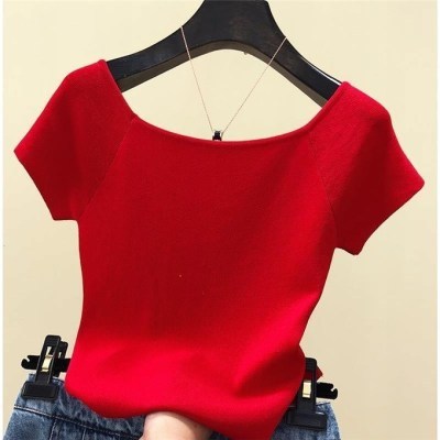 Western style one shoulder short sleeve T-shirt women's summer slim ice silk knitting bottom coat solid half sleeve off shoulder top versatile