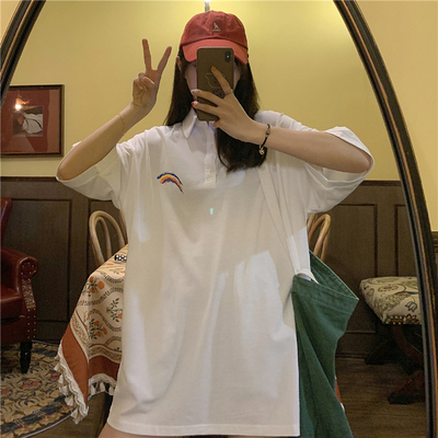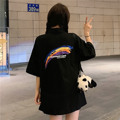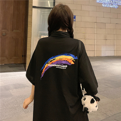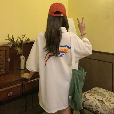 實拍拉架棉中長款領印花寬鬆短袖恤韓版寬鬆女襯衫