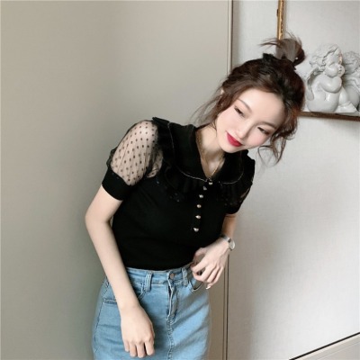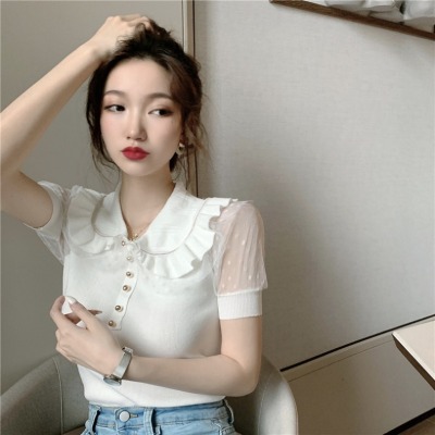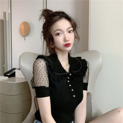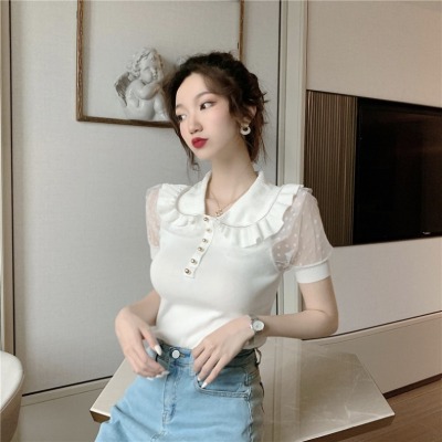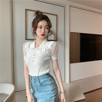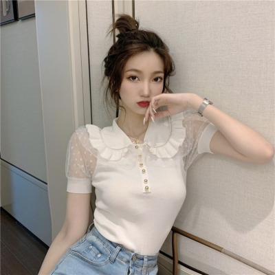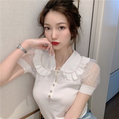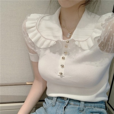 Design feeling French retro baby collar knitting mesh stitching bubble sleeve short sleeve T-shirt clavicle machine top female