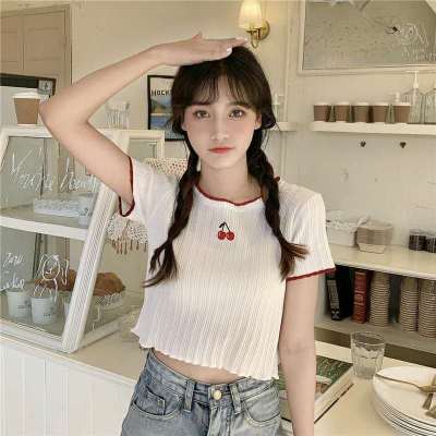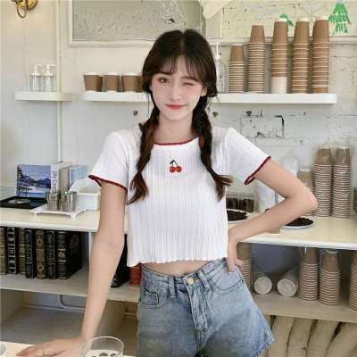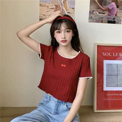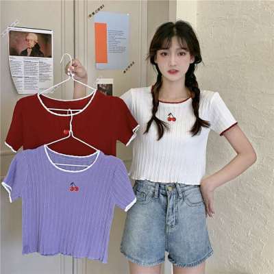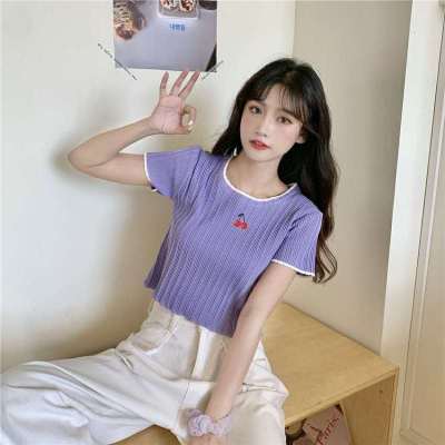 New knitwear short sleeve slim summer thin top short elegant cherry embroidered cute T-shirt
