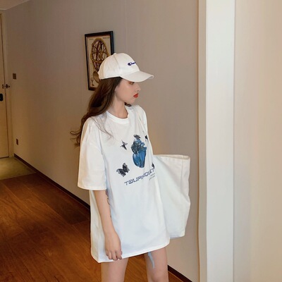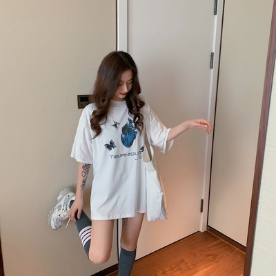 Real price real shot Korean version ins loose BF printing medium length T-shirt lazy style top
