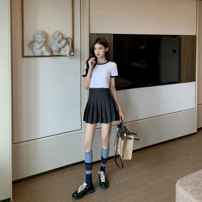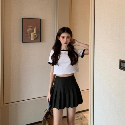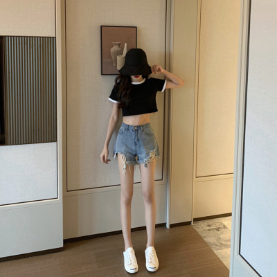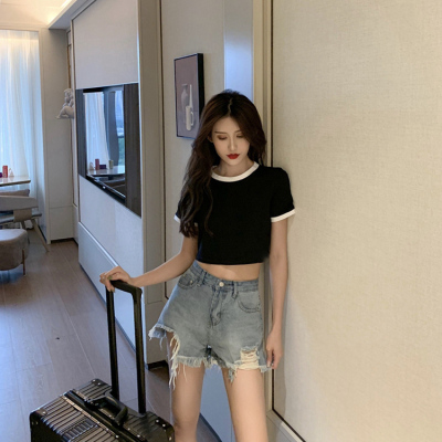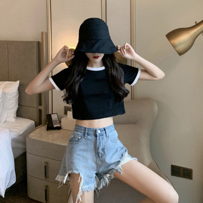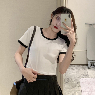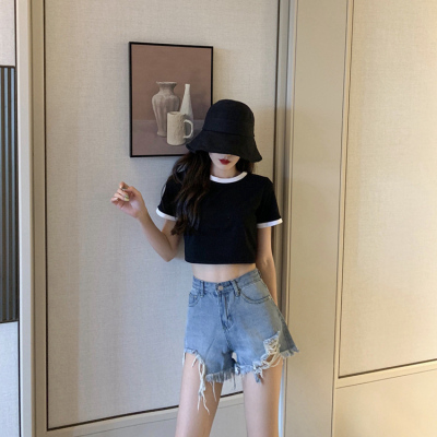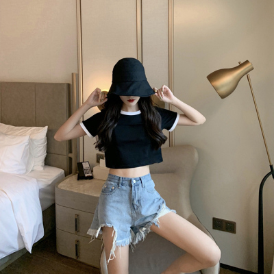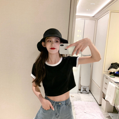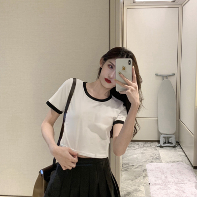 Hong Kong style letter high waisted short sleeve T-shirt with missing navel for women