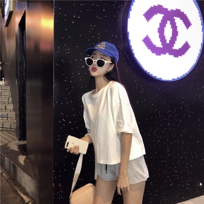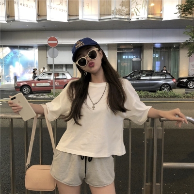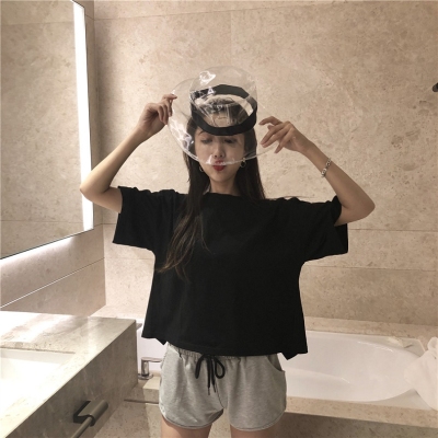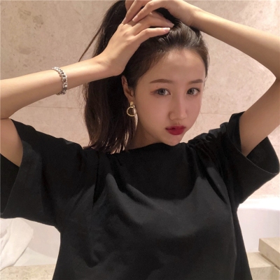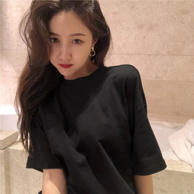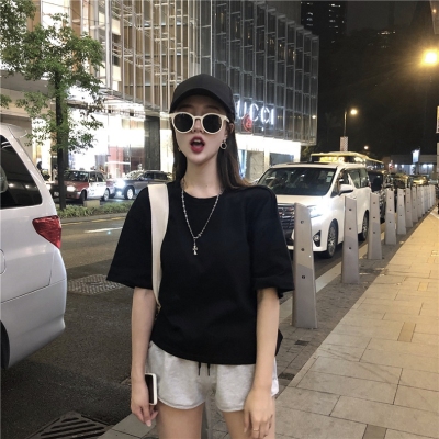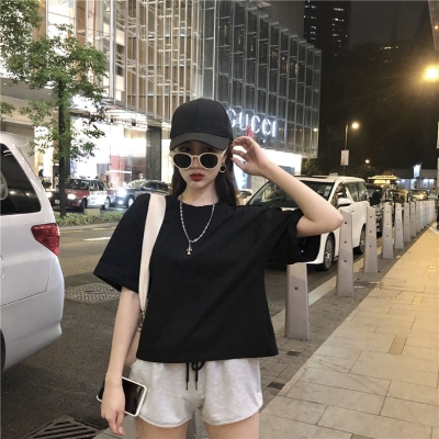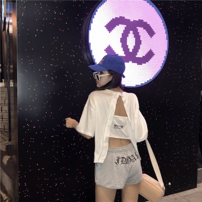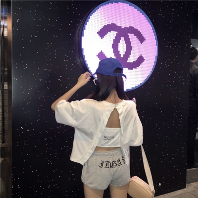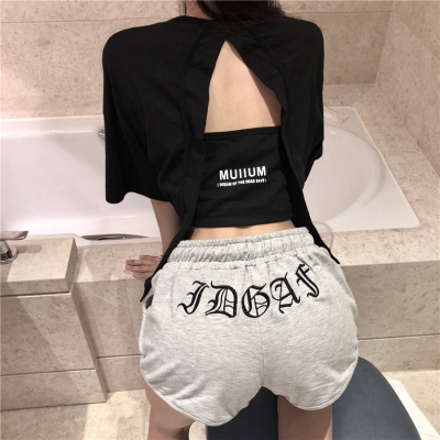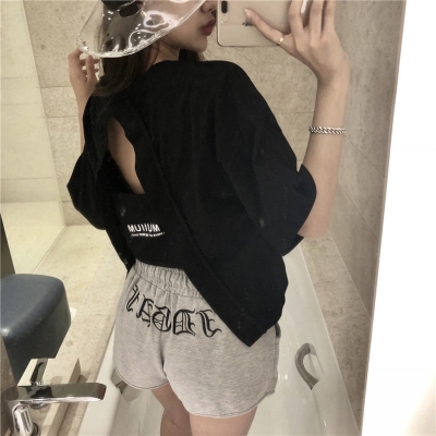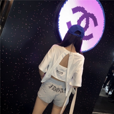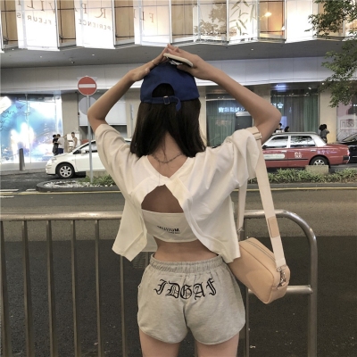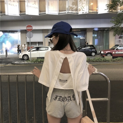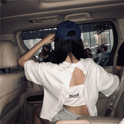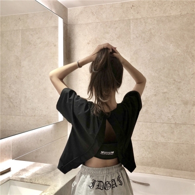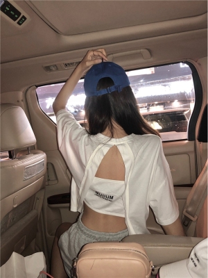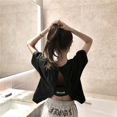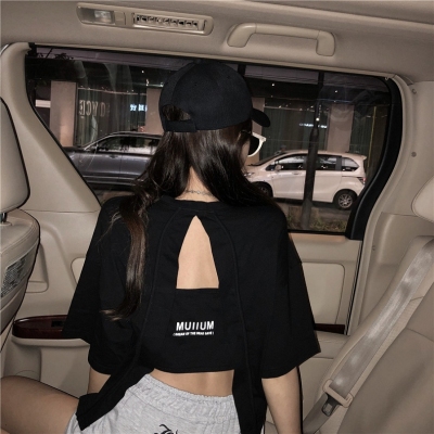 官圖 棉 小心機怪味少女黑色露背t恤女短袖上衣