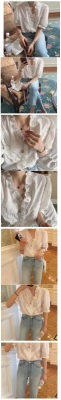White short sleeve shirt women's design sense small retro ins wood ear edge bubble sleeve V Neck sweet temperament short sleeve lining