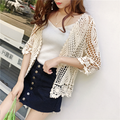 Real shot hollow out knitwear long sleeve cardigan women's spring and summer Korean women's loose and versatile 7-point sleeve short style