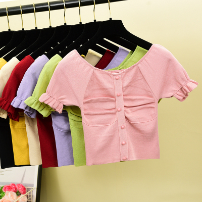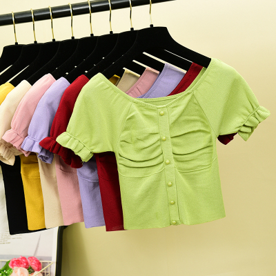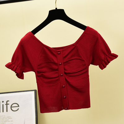 New Retro French pleated collarbone slim short sleeve knitwear woman