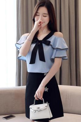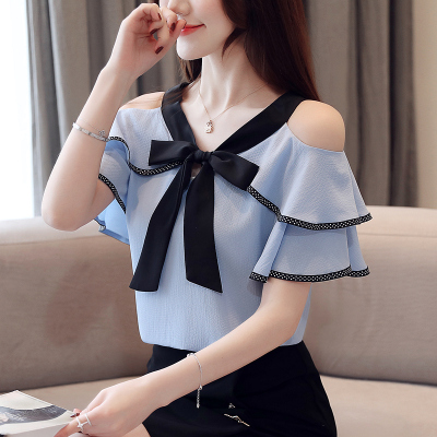 Real photo chiffon blouse women's summer new Korean version very fairy top off shoulder short sleeve westernized off shoulder sling