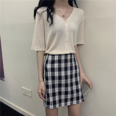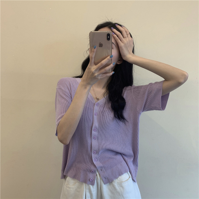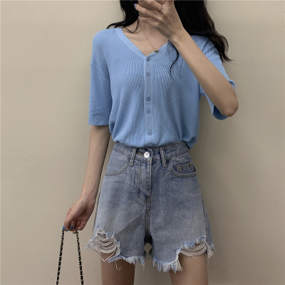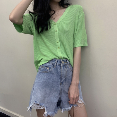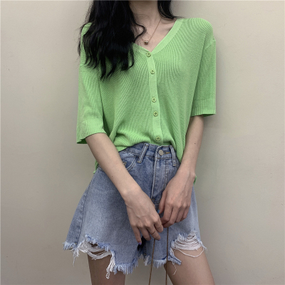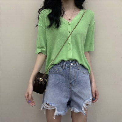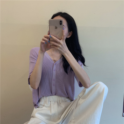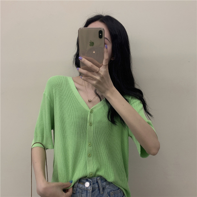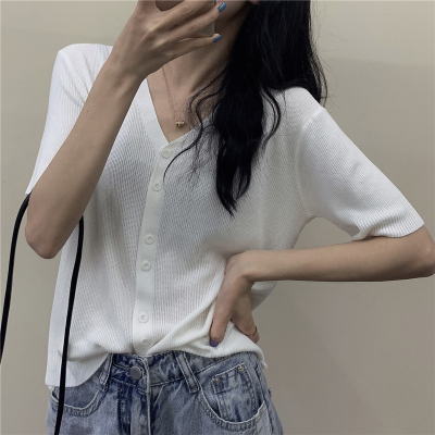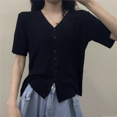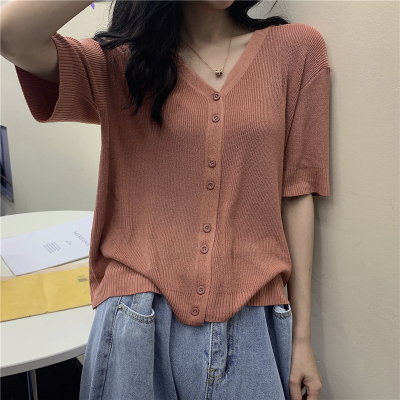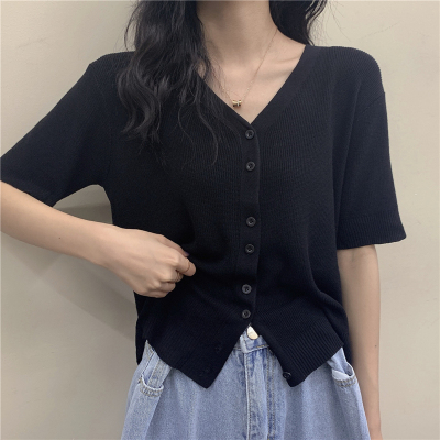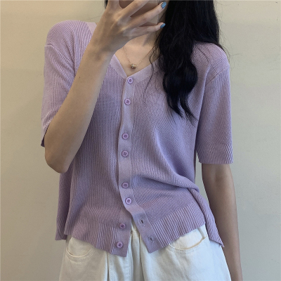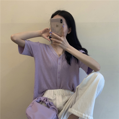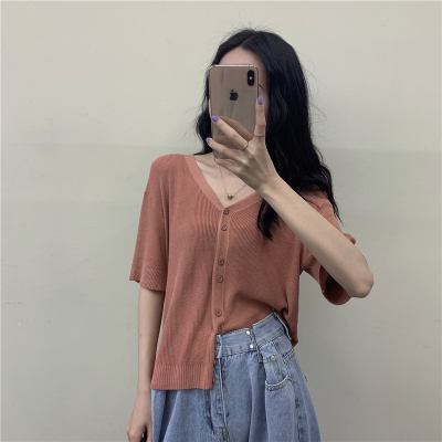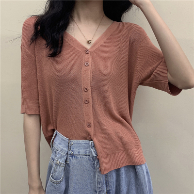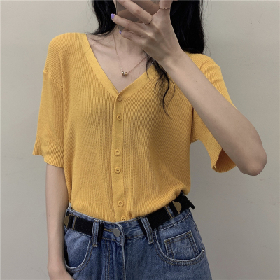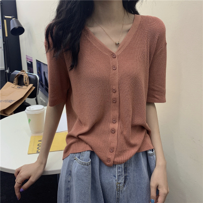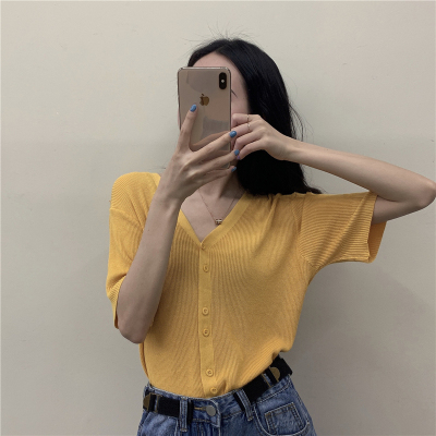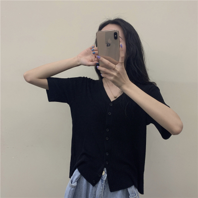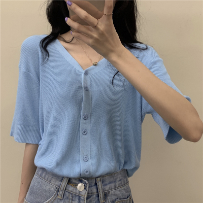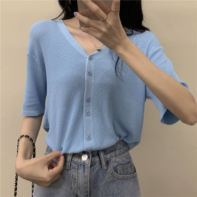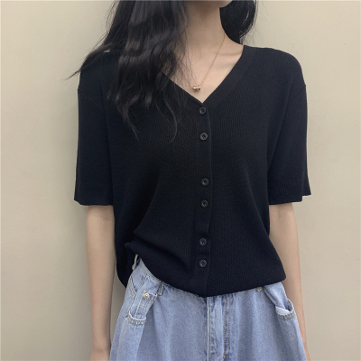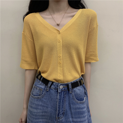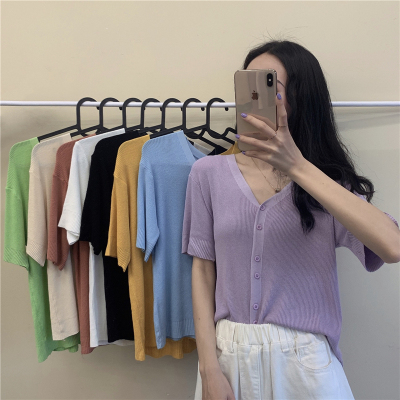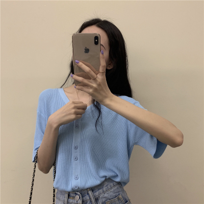 Real photo real price simple sweet V single breasted knitted short sleeve blouse