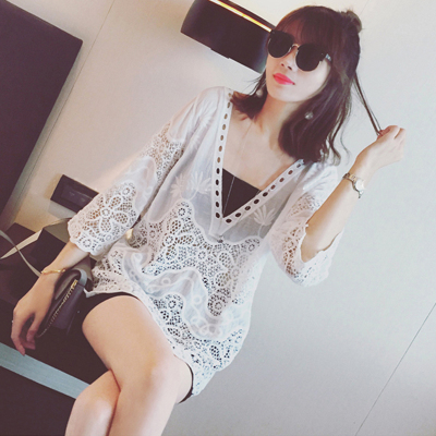 Cut out blouse medium length lace embroidery hook flower V-neck top 3 / 4 sleeve large women's Korean plate width