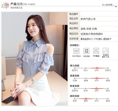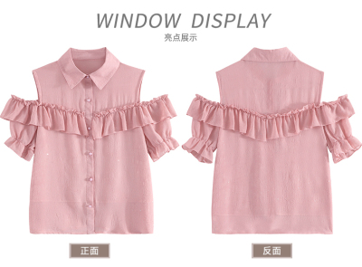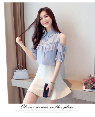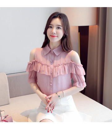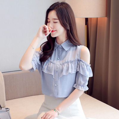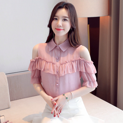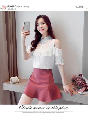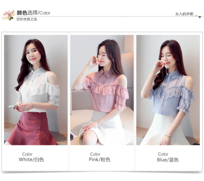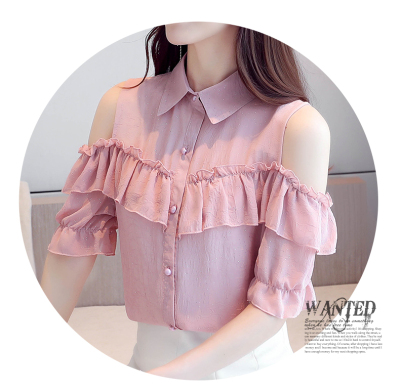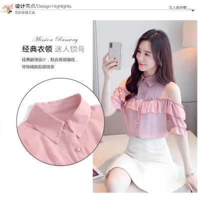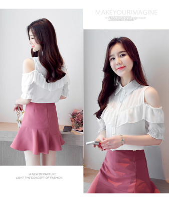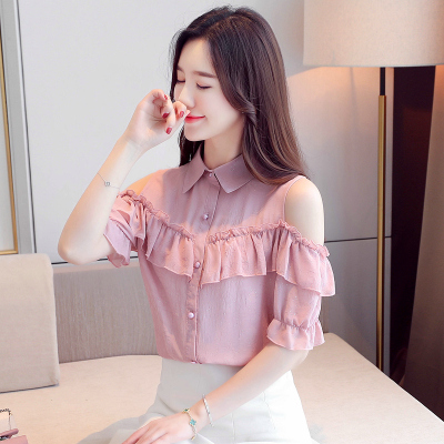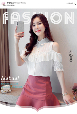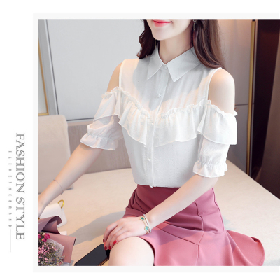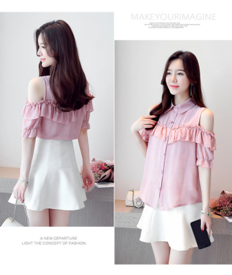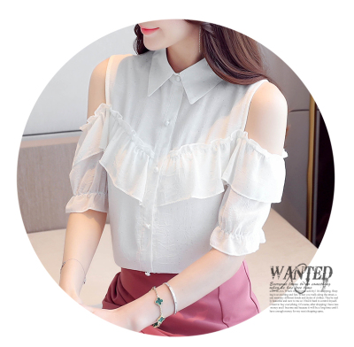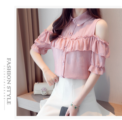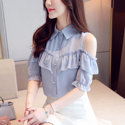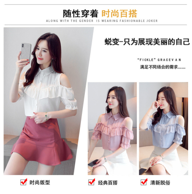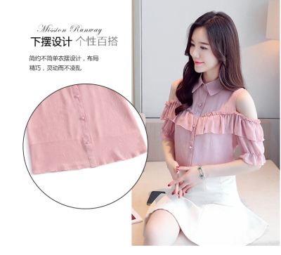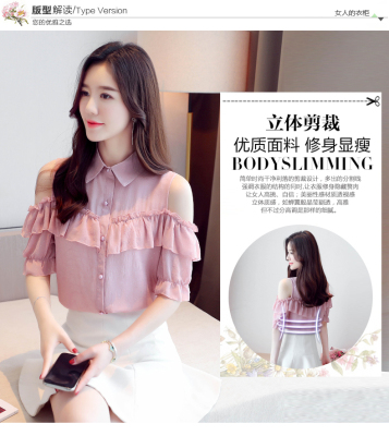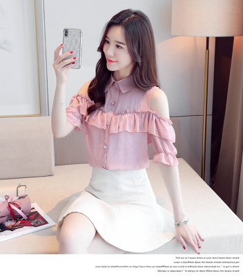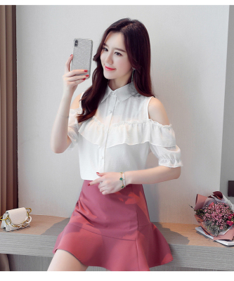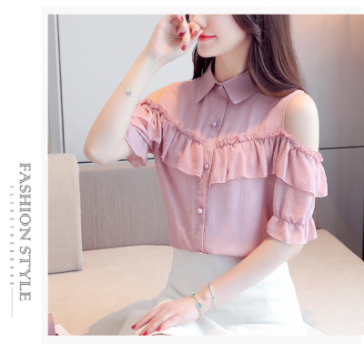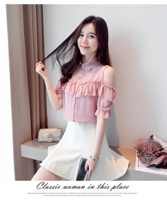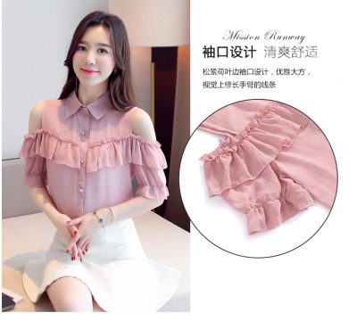 Leaky shoulder chiffon blouse women's short sleeve summer super immortal Korean version loose air small shirt with ruffle edge off shoulder top trend