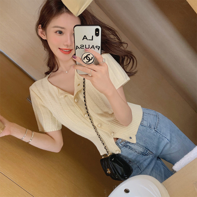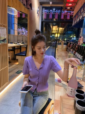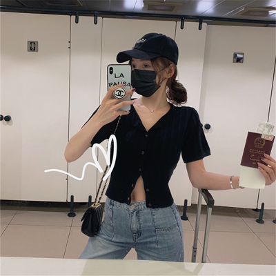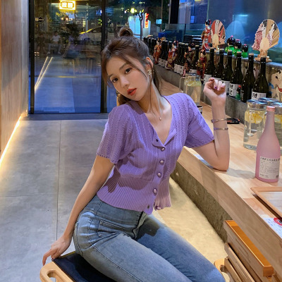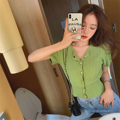 Korean sexy V-neck fit short coat women's air net red short sleeve knitting
