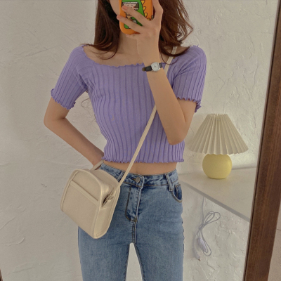 Summer 2020 new small short heart machine clavicle slim top thin square collar short sleeve knitted T-shirt for women