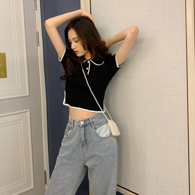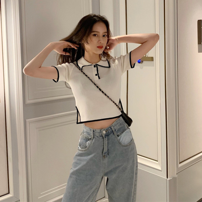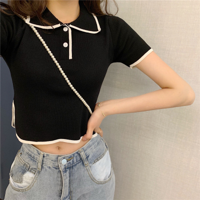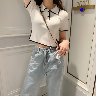 Summer Korean 2020 new slim chic color contrast polo collar short style short sleeve knitwear women's wear