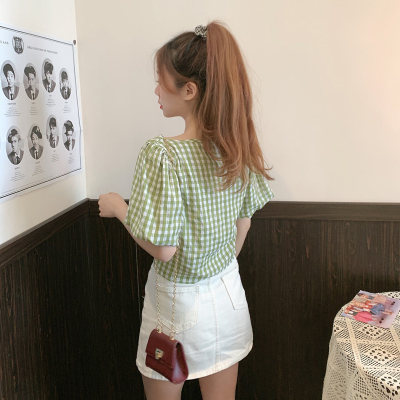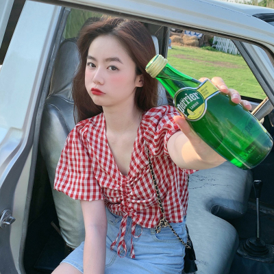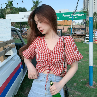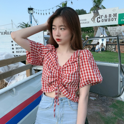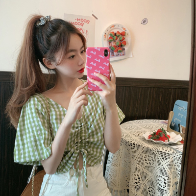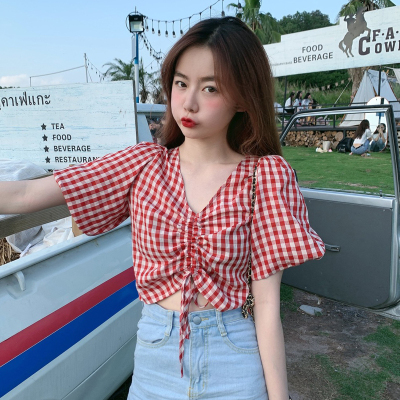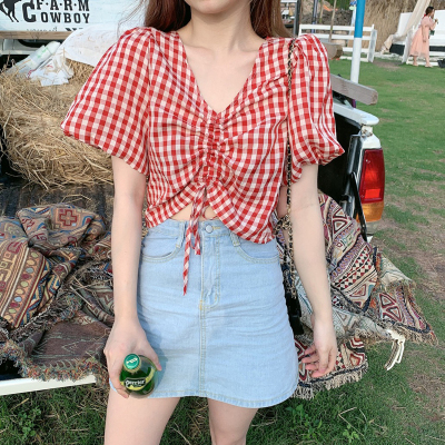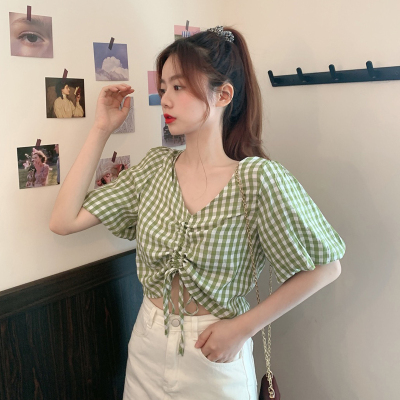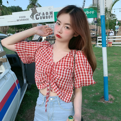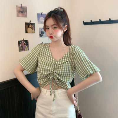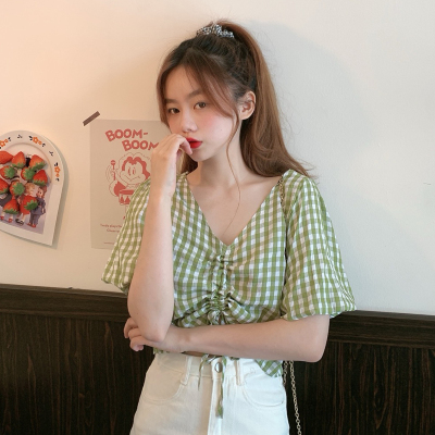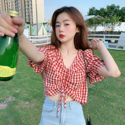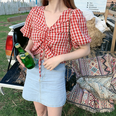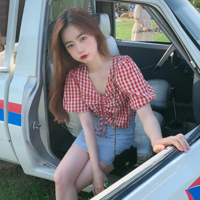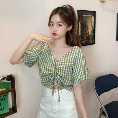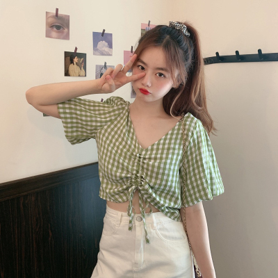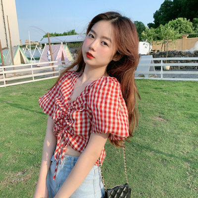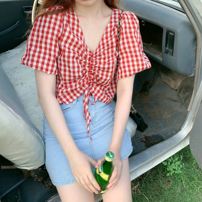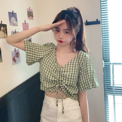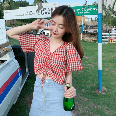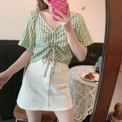 Real shot ~ 100% polyester ~ Plaid Shirt women's V-neck drawstring short small design sense retro top trend