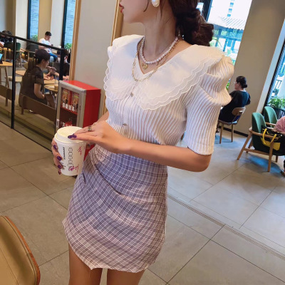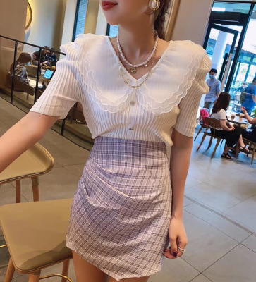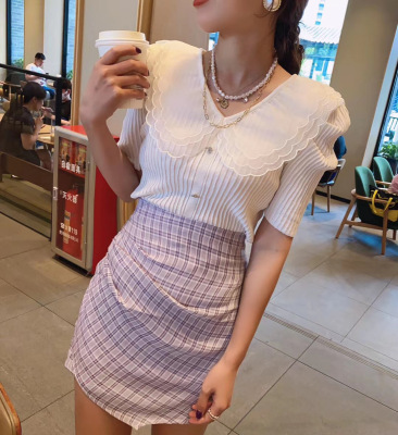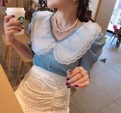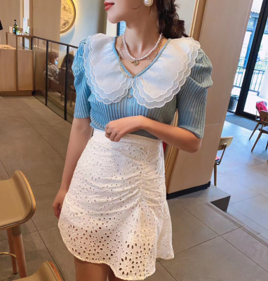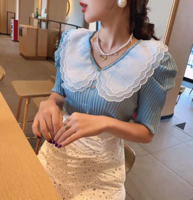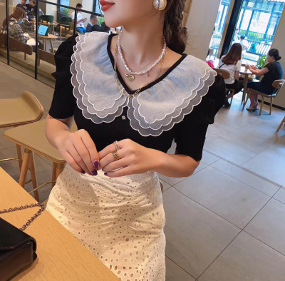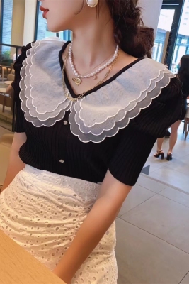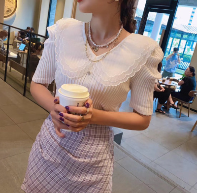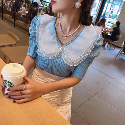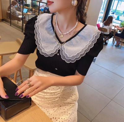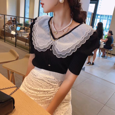 Summer 2020 new style retro mesh baby collar stitching knitted jacket with versatile style bubble Short Sleeve T