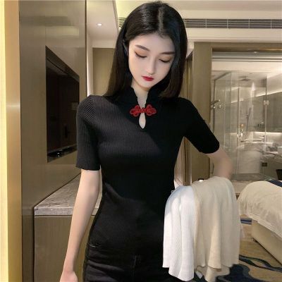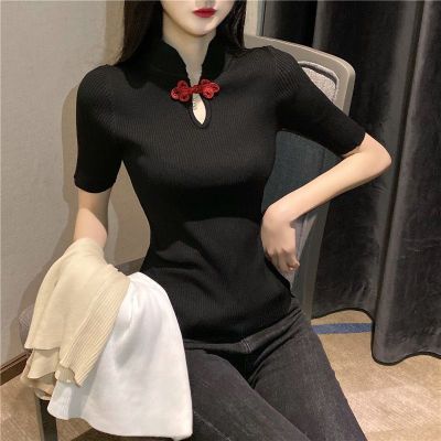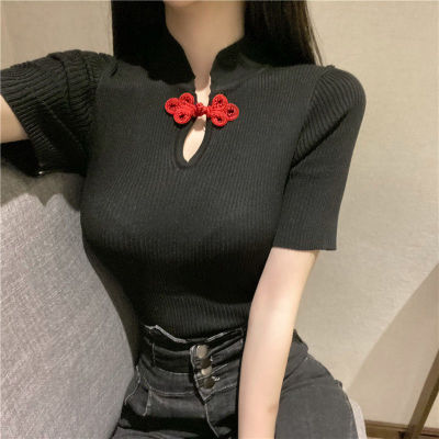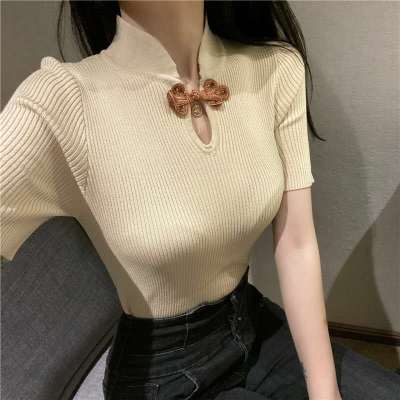 2020 summer retro button careful machine top women show thin T-shirt foreign style ice silk short sleeve T-shirt