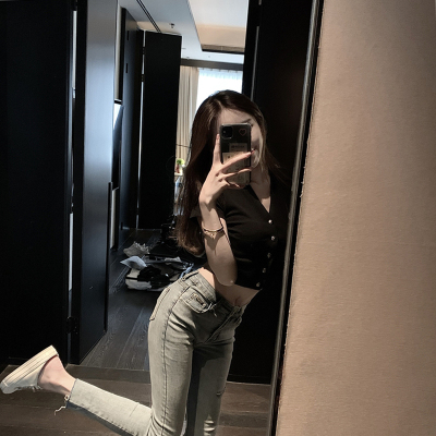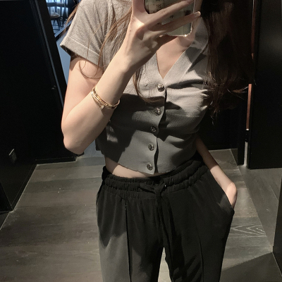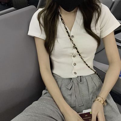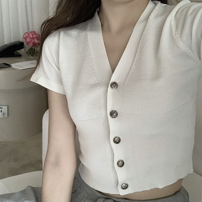 Small V-neck short sleeve knitted cardigan women's short thin sexy bottoming shirt tight button white T-shirt fashion