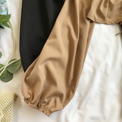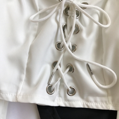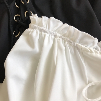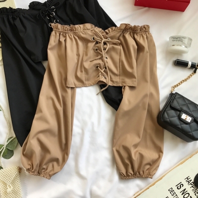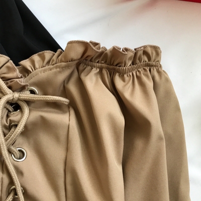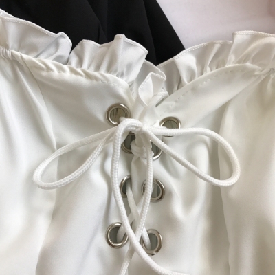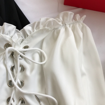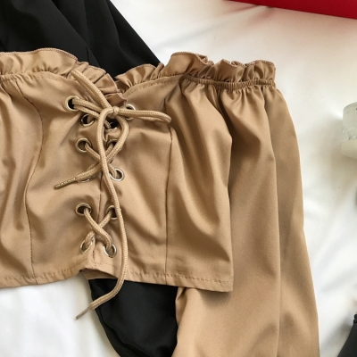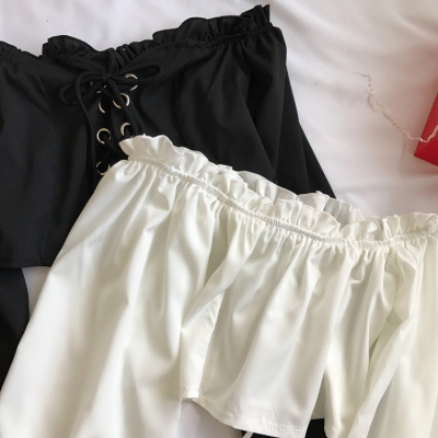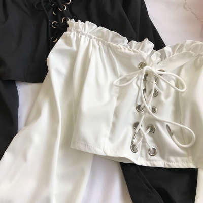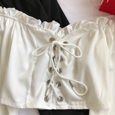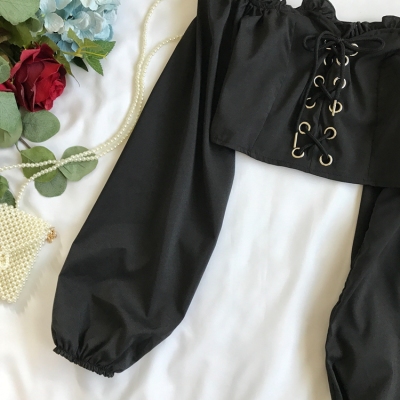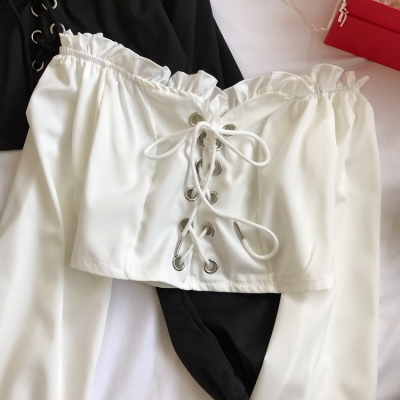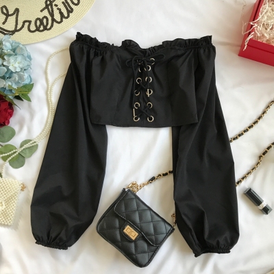歐美風2020秋裝木耳邊一字領露肩短款高腰露臍燈籠袖綁帶長袖上衣