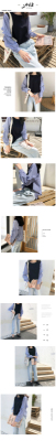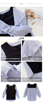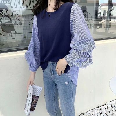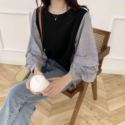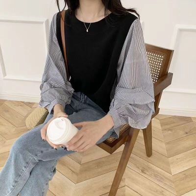 2020 South Korea autumn new chic versatile loose crew neck contrast stitching striped ruffle sleeve shirt women's top