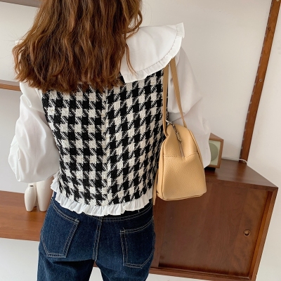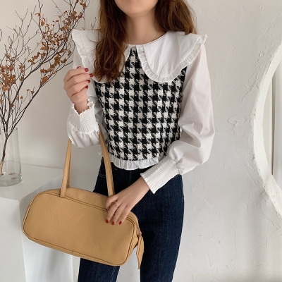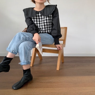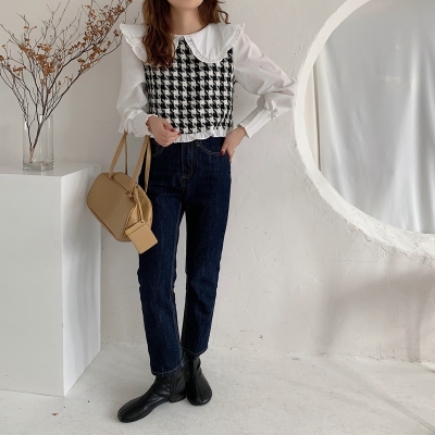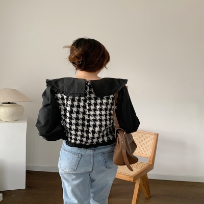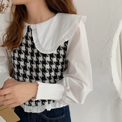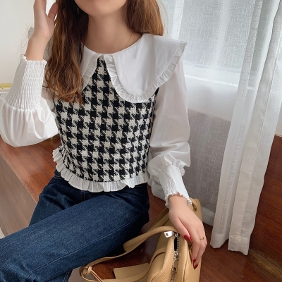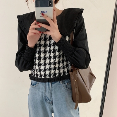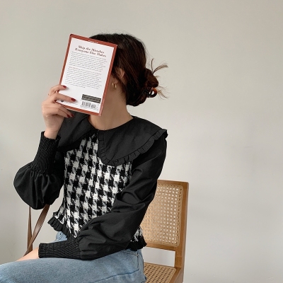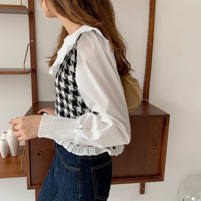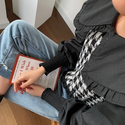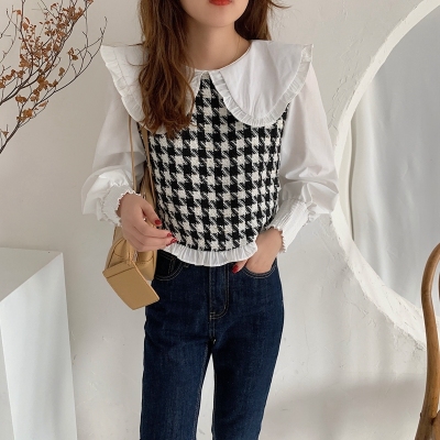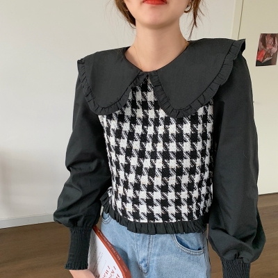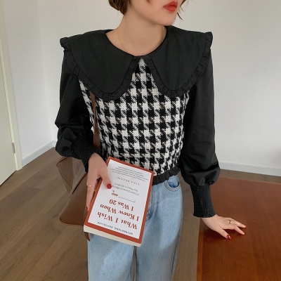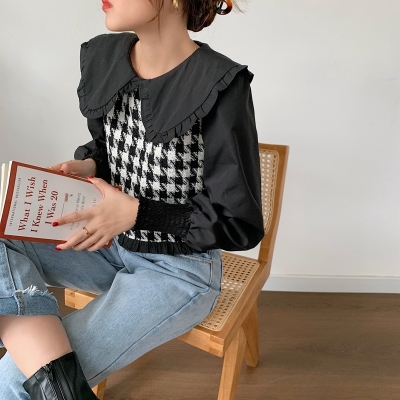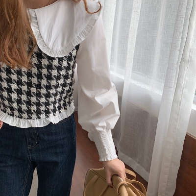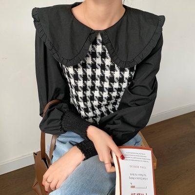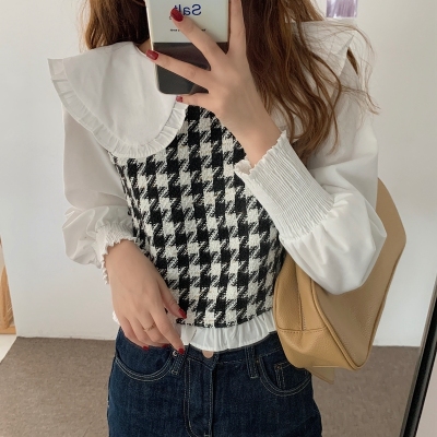 Real price autumn and winter Korean version of French retro temperament new design sense stitching thousand bird lattice fake two pieces of baby collar shirt