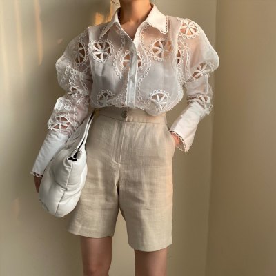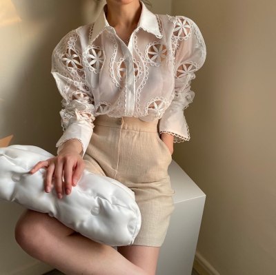 韓國chic春季復古設計感翻領重工鏤空氣質百搭長袖襯衫女