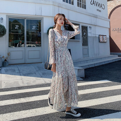 Spring and winter bottoms, small fresh broken flower V-neck jumpsuit, popular over the knee, new long sleeve, waist closing and thin long skirt