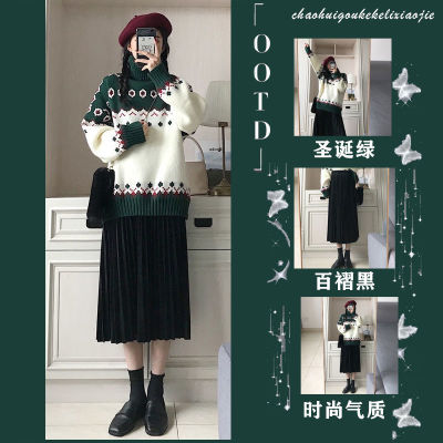 秋冬新款赫本輕熟風法式復古御姐慵懶聖誕毛衣時髦炸街百褶裙套裝