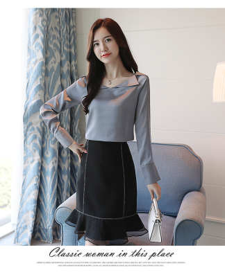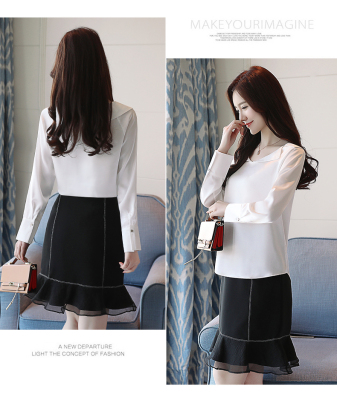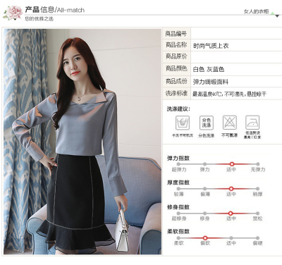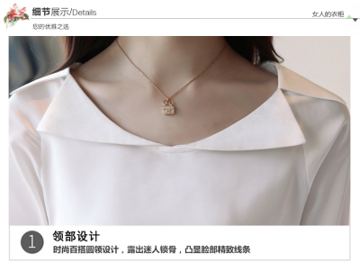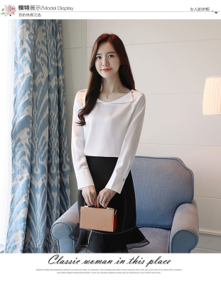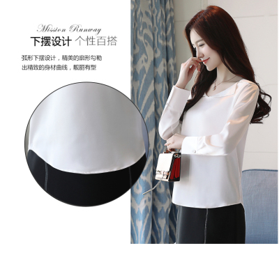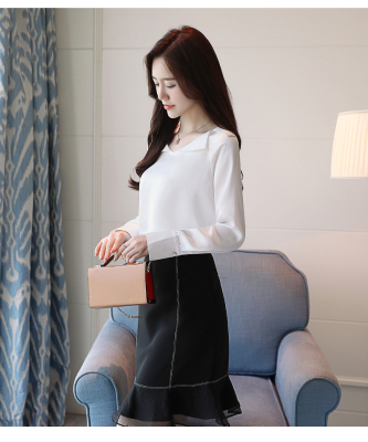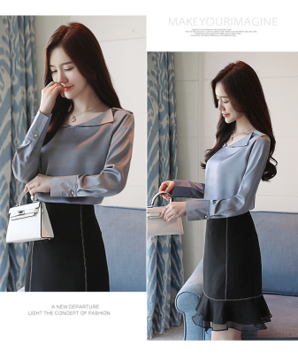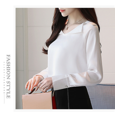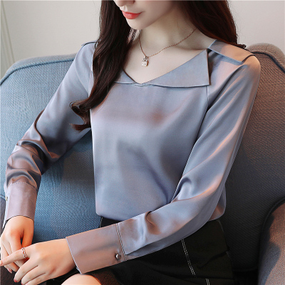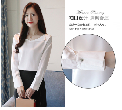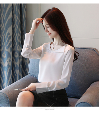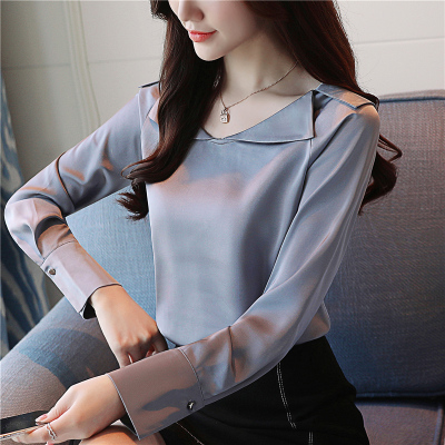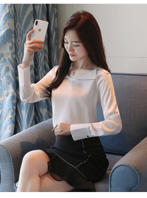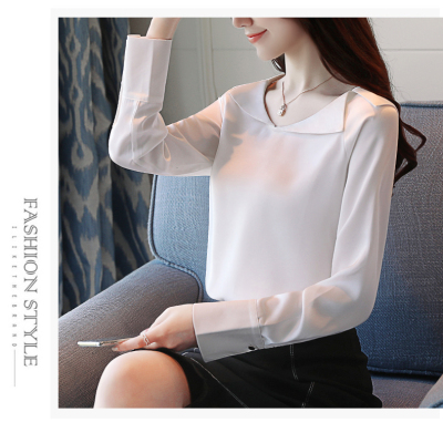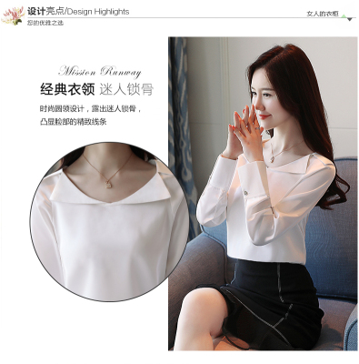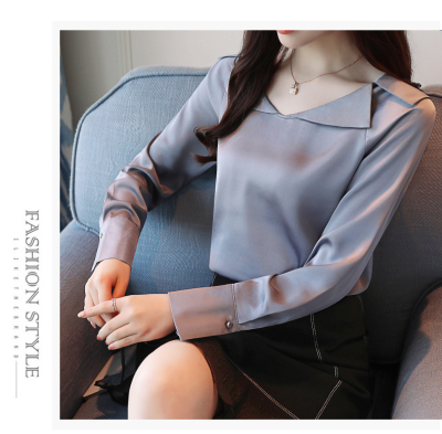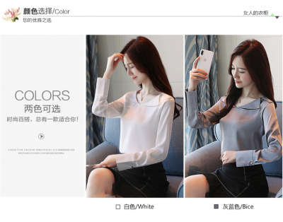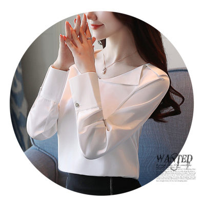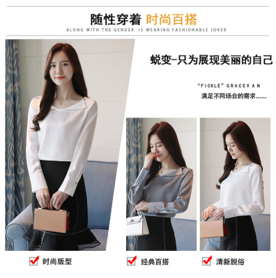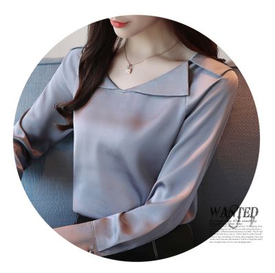 Real shot Korean collar Satin Long Sleeve Chiffon shirt women's one line shoulder exposed clavicle top loose and thin shirt