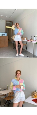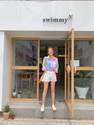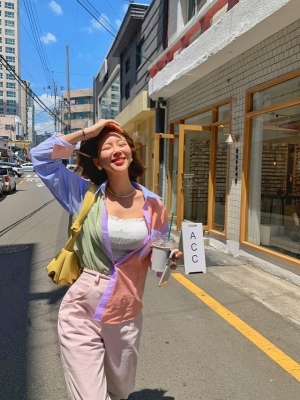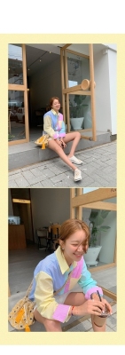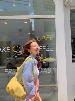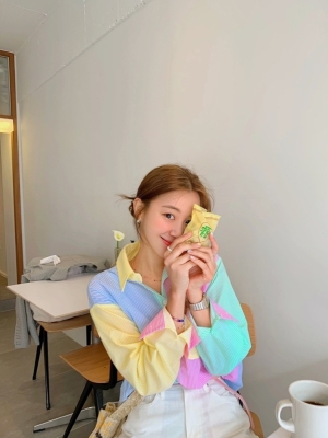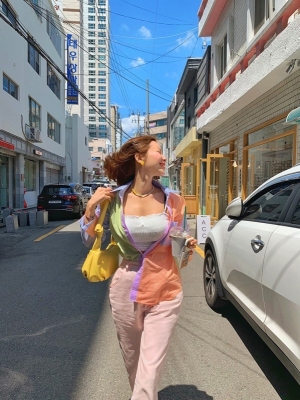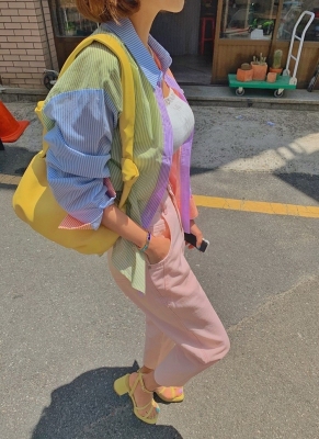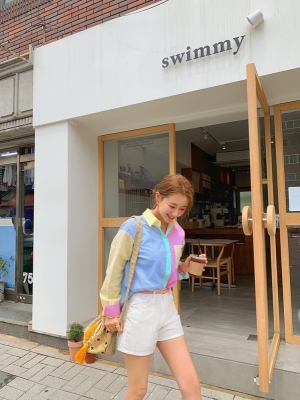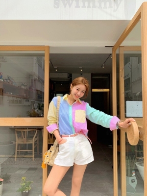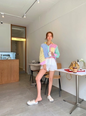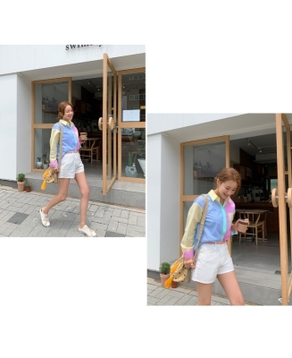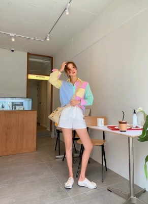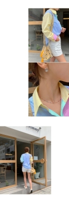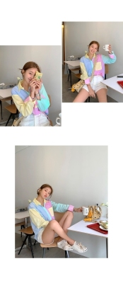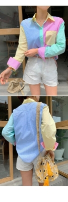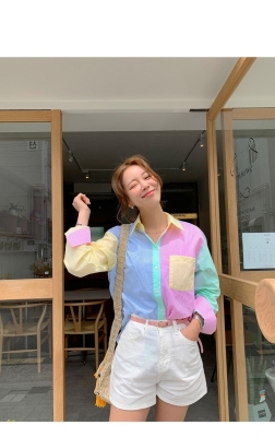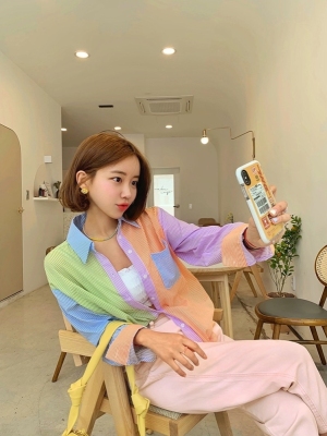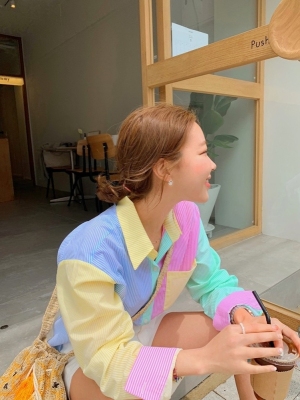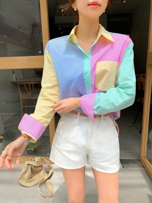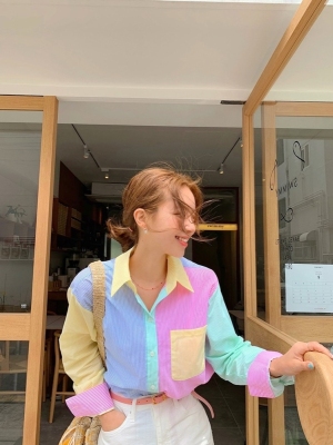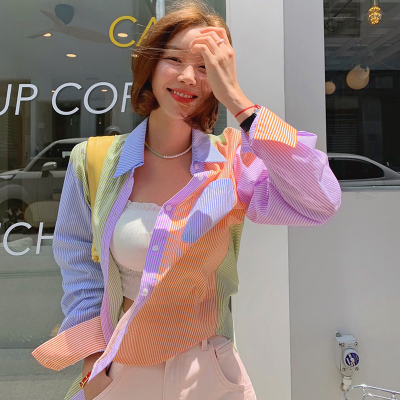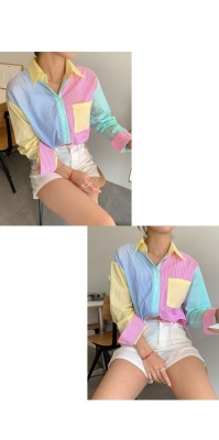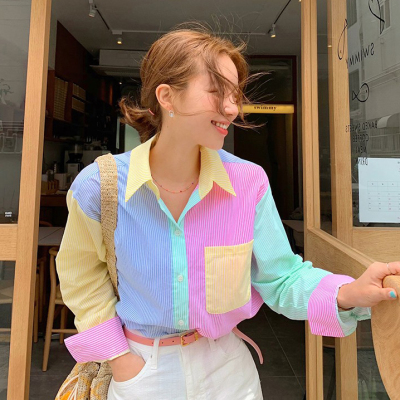 Spring new candy color contrast vertical stripe fashion Korean shirt loose drape female long sleeve shirt