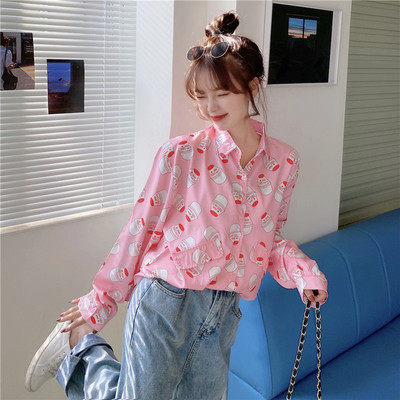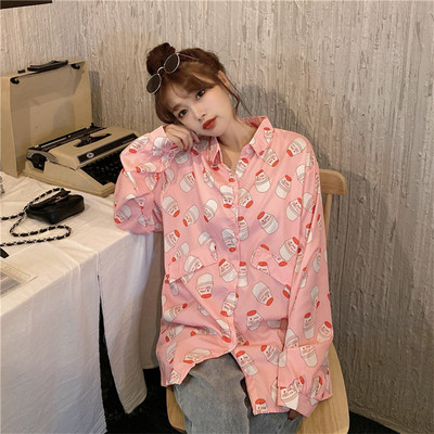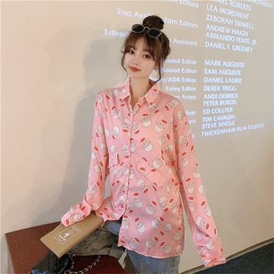 草莓牛奶襯衫美少女寬鬆韓版復古早秋上衣長袖學生新款衫