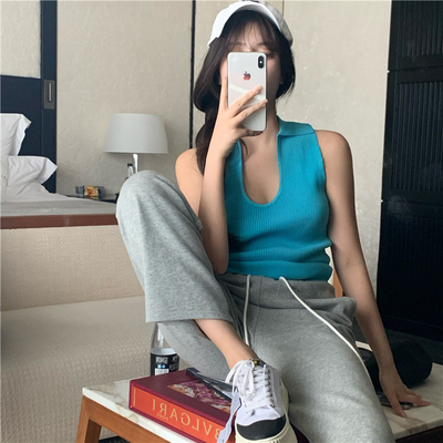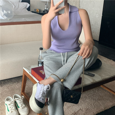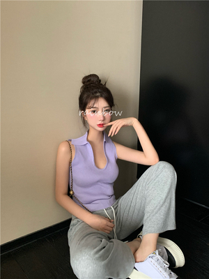 Real shot Lapel deep V knitting fruit green sleeveless sexy vest for women