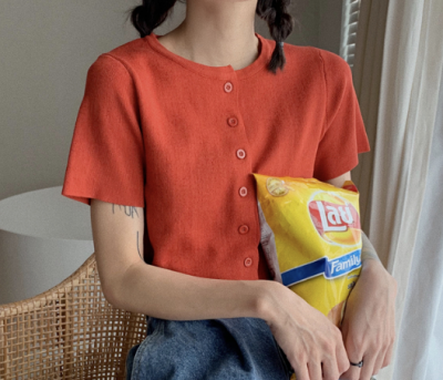 Konjac purple lazy style short sleeve knitted cardigan coat women's slim fit short open navel top spring new
