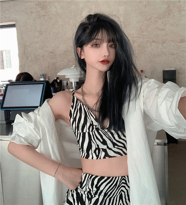 Real price design small white shirt + zebra vest high waist split hip skirt