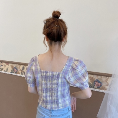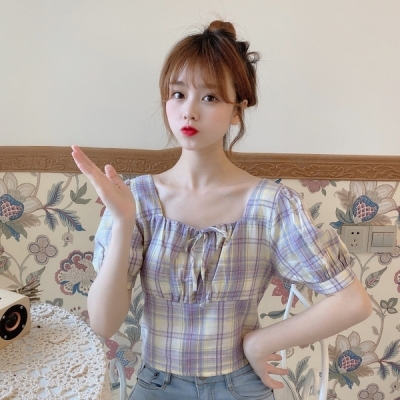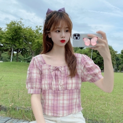 Real auction real price cotton careful machine lace Plaid square collar slim Short Sleeve Shirt Top