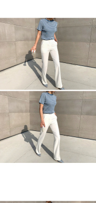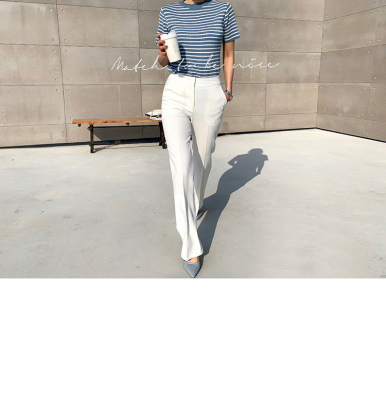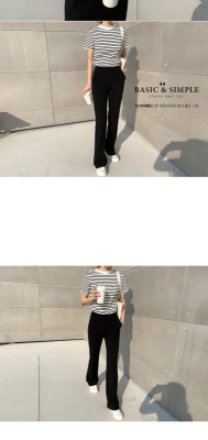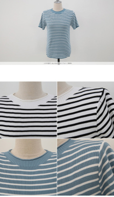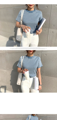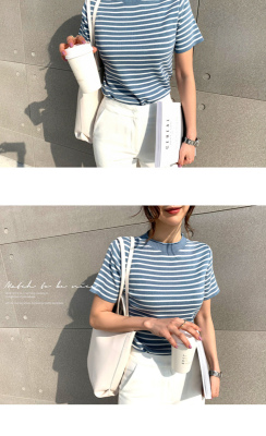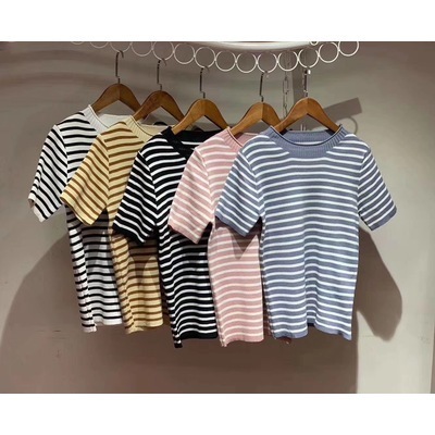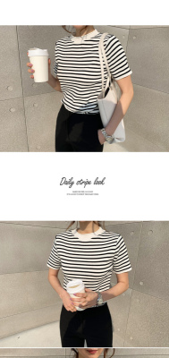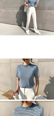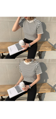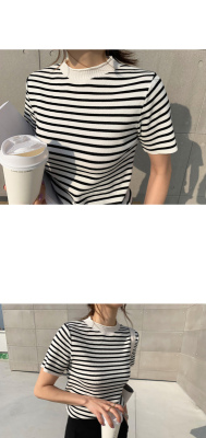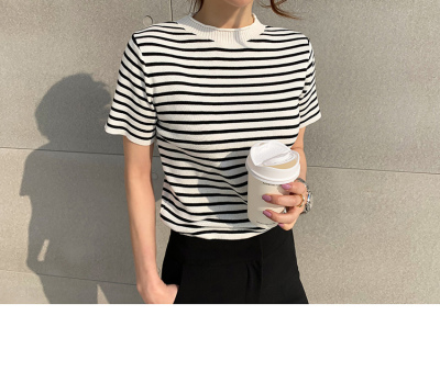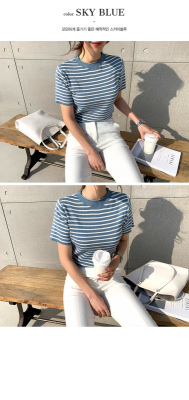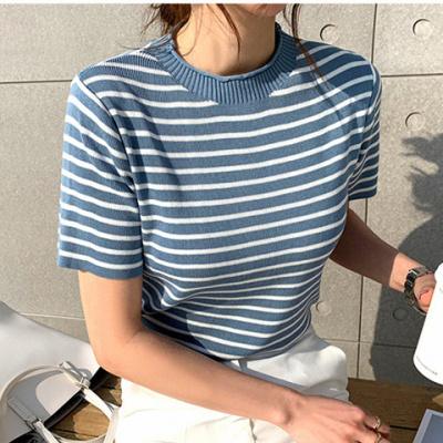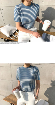 Summer new Korean fashion stripe fresh versatile casual round neck ice silk knitted T-shirt