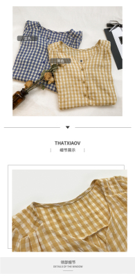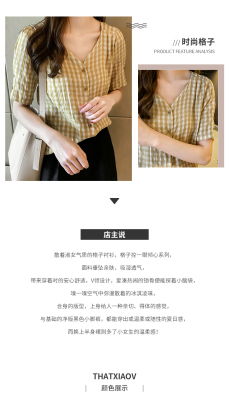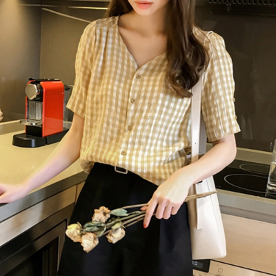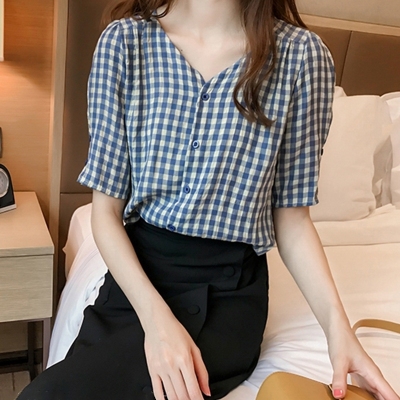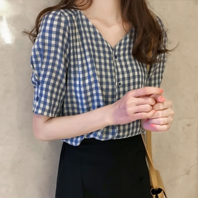 Official figure fiber V-neck Plaid Shirt women's design sense minority bubble sleeve short sleeve