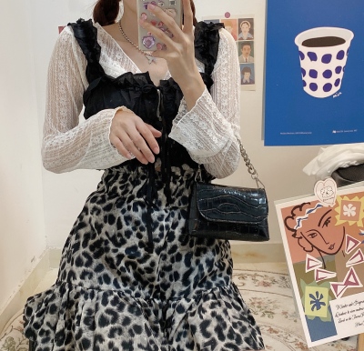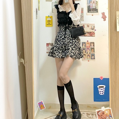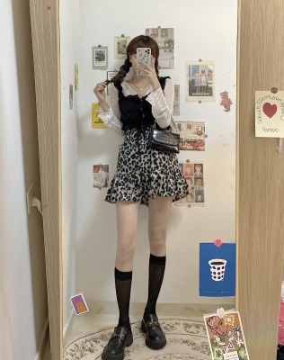 Real Korean chic retro LACE SLING + anti light leopard print skirt + short lace sunscreen T-shirt