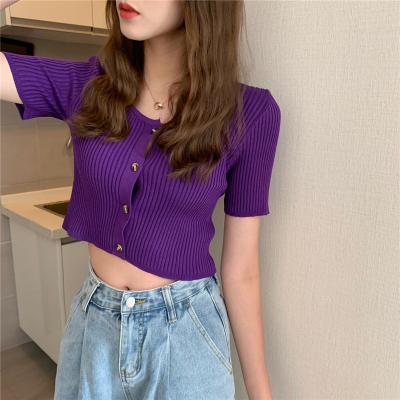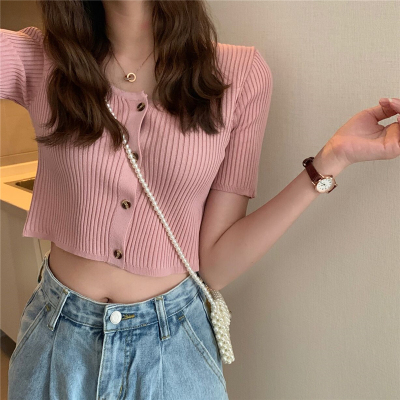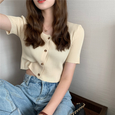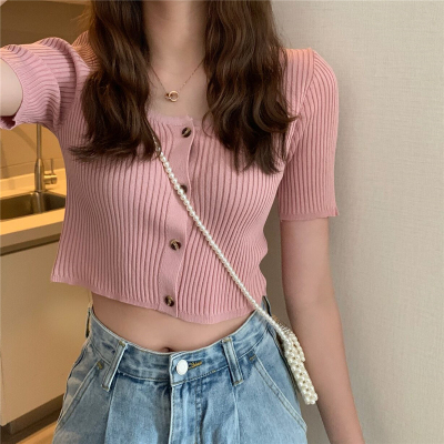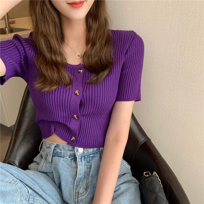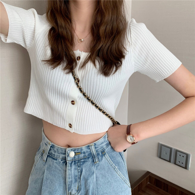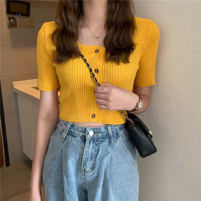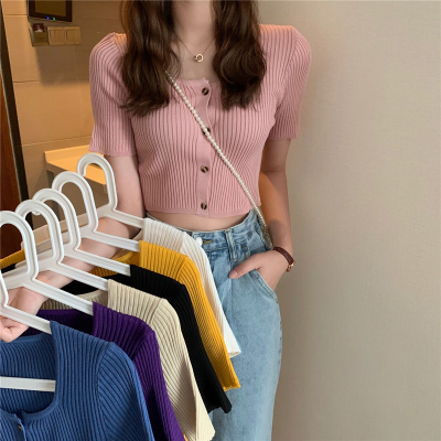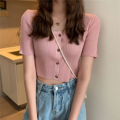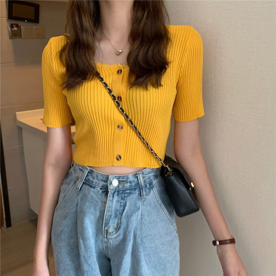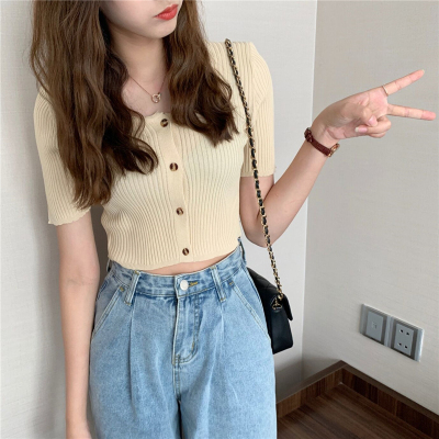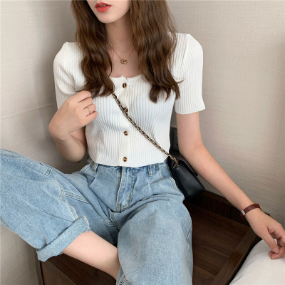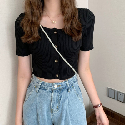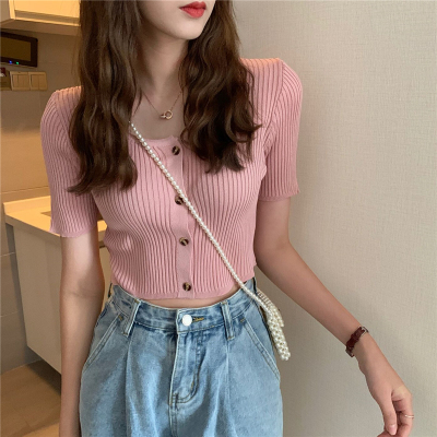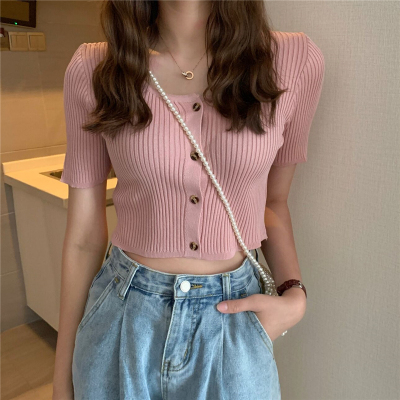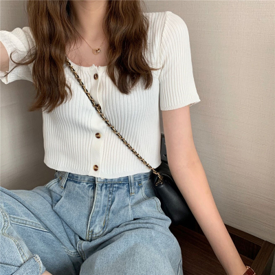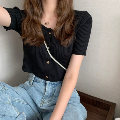 Real price Korean ins short sleeve retro solid color slim short knitted T-shirt women's small square collar top