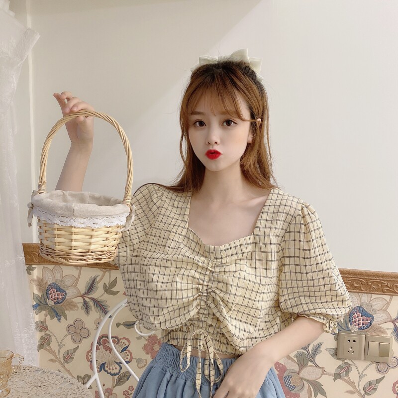 Real photo of 2021 summer drawstring short sleeve shirt with square neck