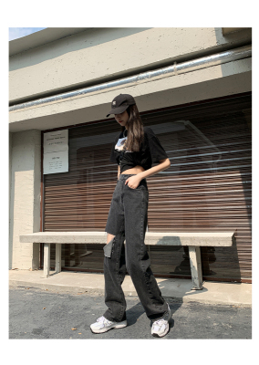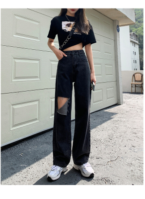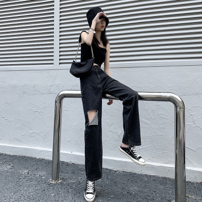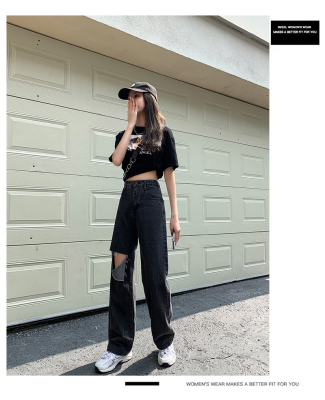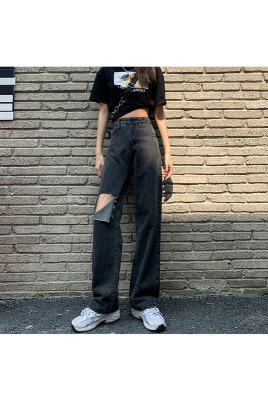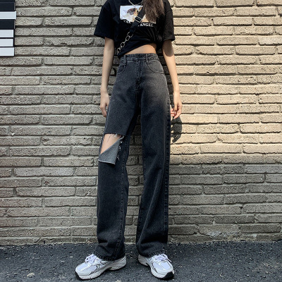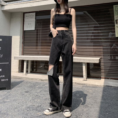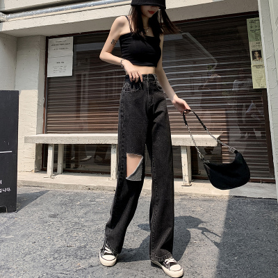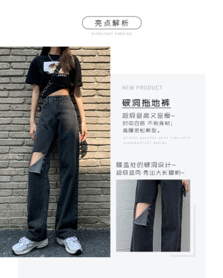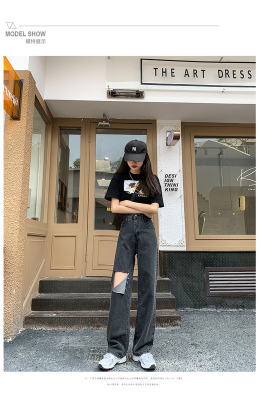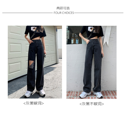 Summer thin grey black high waist holed jeans women's drape feeling floor dragging wide leg pants loose straight tube