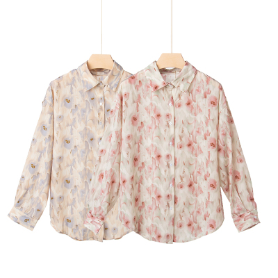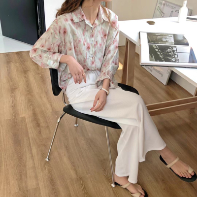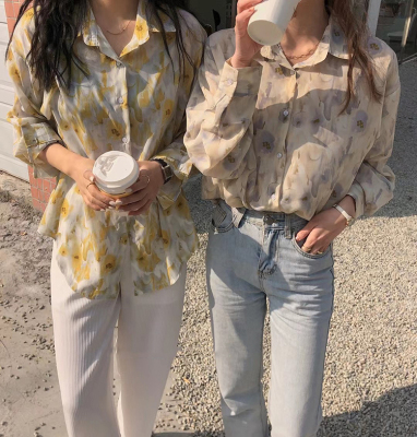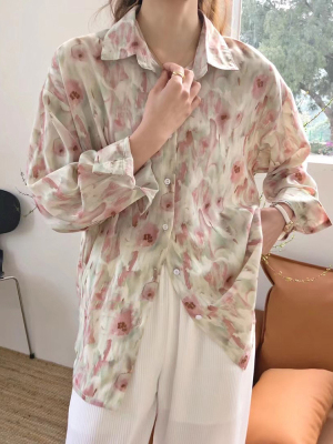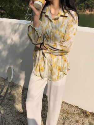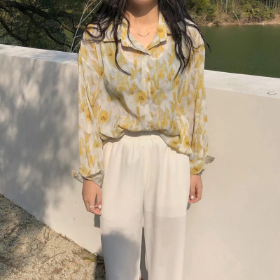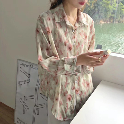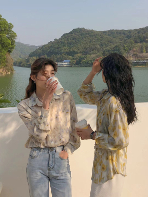 Retro Hong Kong Style halo dye printed shirt new thin and loose chiffon long sleeve collar top in spring and summer