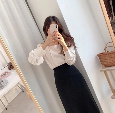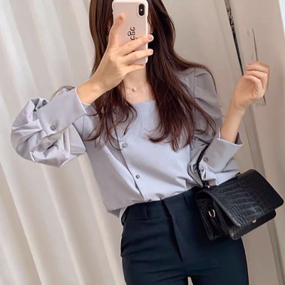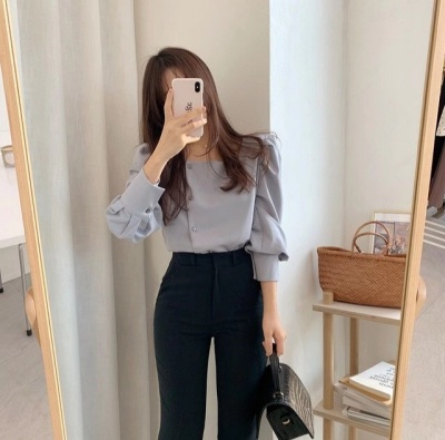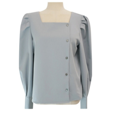 French retro square collar thin versatile shirt beware of machine leakage clavicle design lady Lantern Sleeve Top