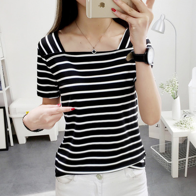 Striped short sleeve T-shirt women's 2021 summer new large one neck top Korean version slim and versatile fashion T-shirt